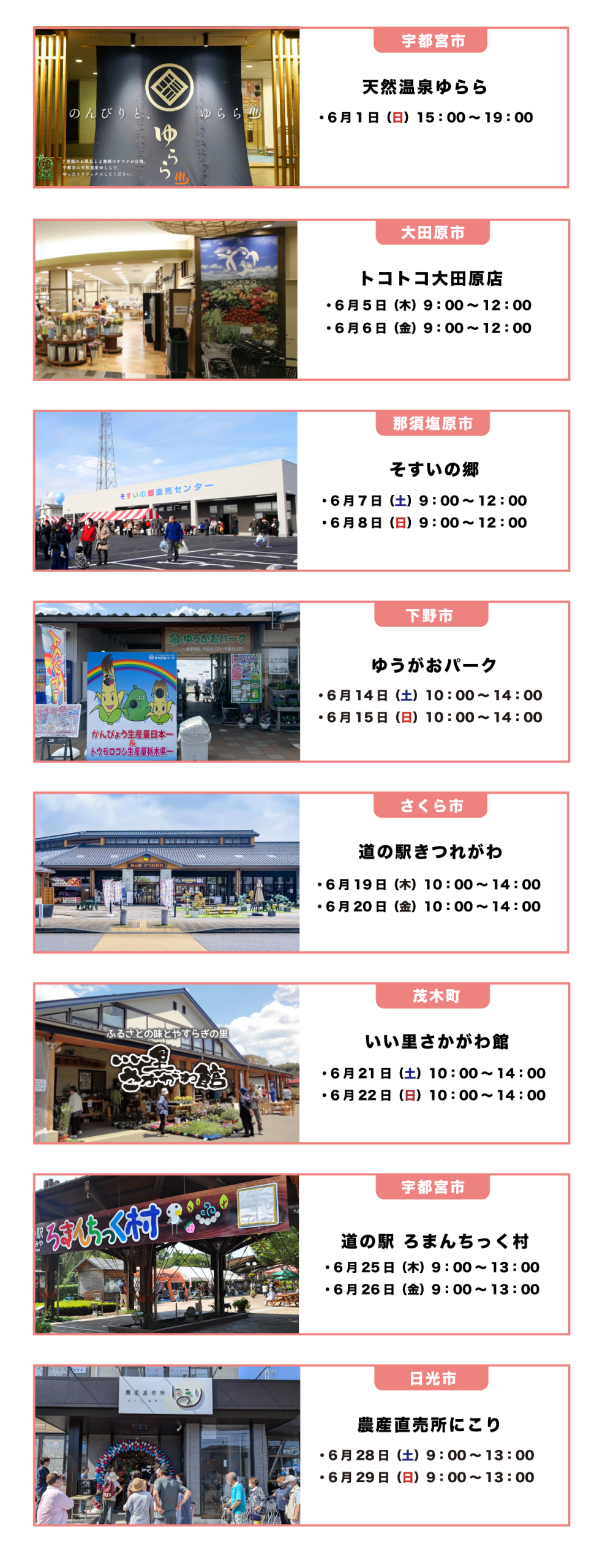 小山市 絹ふれあいの郷、那須塩原市 そすいの郷、宇都宮市 ろまんちっく村、茂木町 いい里さかがわ館、下野市 ゆうがおパーク、大田原市 トコトコ大田原店、さくら市 道の駅きつれがわ、栃木市 道の駅にしかた